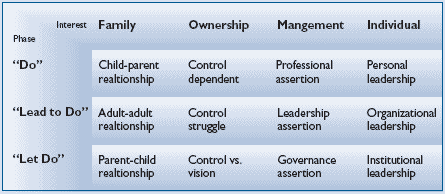 The “Do” phase sees the potential next generation leader enter the business, with the parent generation still exercising an active leadership role. The inter-generational family relationship still tends to be biased towards a child-parent relationship, with the aspiring leader attempting to complete the transition to an adult-adult relationship. On the ownership level, control still tends to stay with the parent generation. On the management level, the aspiring leader focuses on professional assertion attempting to gain outside recognition. The individual challenge is to develop personal leadership, as the “Do” phase is characterized as a period of learning, uncertainty, finding and developing his/her role as an independent individual. The “Lead to Do” phase begins with the next-generation family member being appointed to a clearly defined leadership position. On the family level, the relationship with the parent generation has now shifted to an adult-adult nature, with the successor in turn creating a new nuclear family.With the inter-generational distancing, the senior generation often perceives ownership as a vehicle to exercise control – or at least prolong a dependency – of the next generation. A struggle for the control over the family business ownership creates frustrations and uncertainty, also for other stakeholders. This difficult relationship is often also carried to the management level with a lack of boundaries as the next generation family member attempts to assert his leadership control. On an individual level, the key focus of the new leader now shifts to the organizational leadership. The “Let Do” phase mirrors the other side of the “Do”