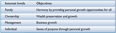 with family considerations. From complexity to competitive advantage The complexities found in family businesses need not be a liability or an additional burden for leadership. In fact, the very existence and proximity to management of family and ownership interests can provide strong and sustainable economical and social benefits to a broad range of stakeholders. This, however, can only be meaningfully achieved if the family business leadership sees the family and ownership interests as legitimate and supportive of the business itself. Most family businesses do not adopt this mindset: the family is perceived as a disturbing element which must be kept at bay. But the truly successful multigenerational family businesses, as seen in the study of the award-winning family businesses, have turned the complexities into a competitive advantage. They fully acknowledge the existence of the four distinct interest levels, and rather than managing conflicting interests they have pro-actively created a simple, consistent and sustainable approach towards defining common objectives, which have the potential to align the four interest levels.
