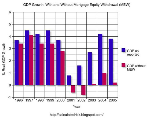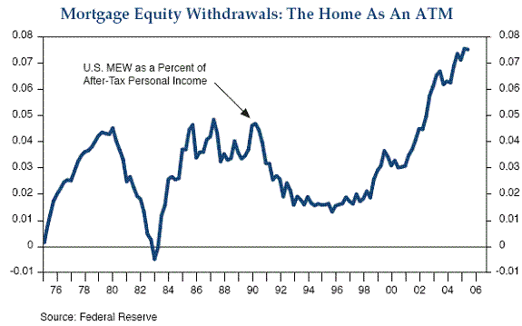 US consumer spending has been higher than expected for some years now, but there are signs that the inevitable swing may occur in 2006. It will change when there is a change in consumer sentiment - when people start to feel that they have enough stuff. But it will also be catalysed by economic balances. At the moment spending has been fuelled in particular by monetising home values. These charts shared by Paul McCulley, Managing Director of PIMCO and John Mauldin, the increasingly famous macroeconomist and hedge fund consultant, show how extended the pendulum is.
