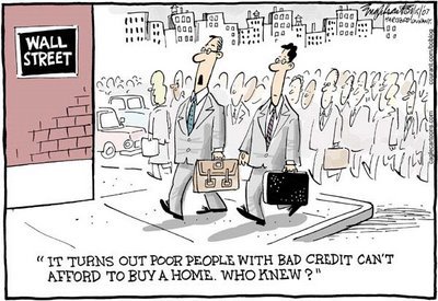 (We won't be seeing so many NINJAS! As far back as 2001, advocates for low-income home-owners had argued that mortgage providers were making loans to borrowers without regard to their ability to repay. Many could not even scrape together the money for a down payment and were being approved with little or no documentation of their income or assets. In the most extreme cases, mortgage brokers were handing out what came to be known as "NINJA" loans, to people with no income, no job and no assets. Often the loans were "no-doc", where the borrower did not have to provide proof of how much they earned. Recent research suggests that in many if not most of these, borrowers (or their brokers) lied about their income. But now as interest rates have risen, so have repossessions. The US housing market has collapsed, and the banks find themselves saddled with a lot of bad debts. In December 2006, the first subprime lenders started failing as more borrowers began falling behind on payments, often shortly after they received the loans. And in February, HSBC, the UK bank, set aside $1.76 billion because of problems in its American subprime lending business.)